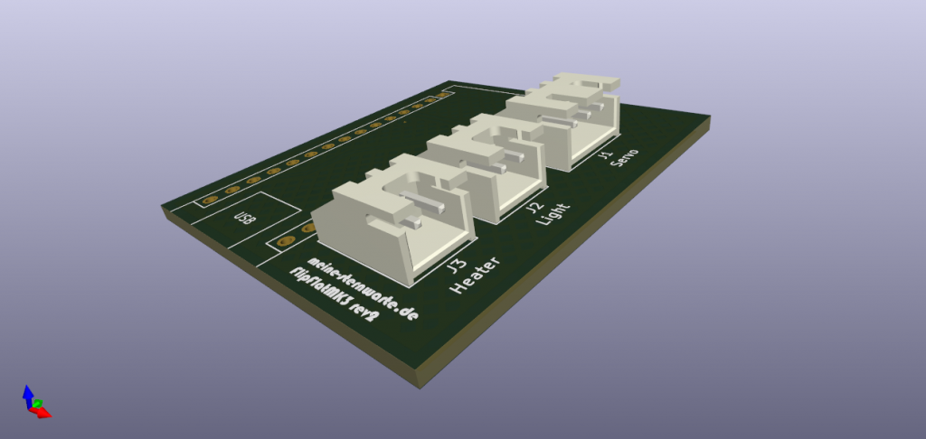 Die selbst entworfene, doppelseitige Leiterplatte misst 40,15 x 45,15 mm, ist 1,5 mm dick und hat eine 35 µm Kupferauflage. Die wenigen SMD-Bauteile sind einfach zu bestücken, und der Rest kann direkt eingelötet werden. Im Gehäuse ist unten eine Durchführung für den JST-Stecker des Servos und im oberen Bereich eine kleine Öffnung für die beiden Kabel von der Heizung und der Lampe vorgesehen.